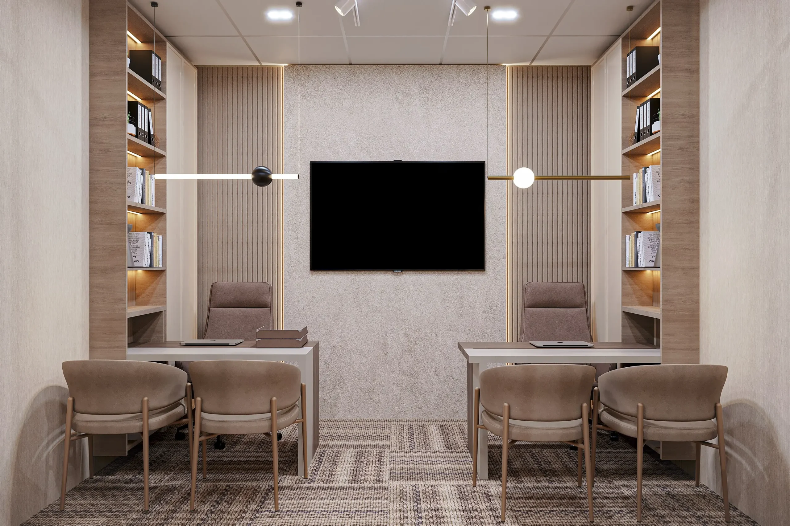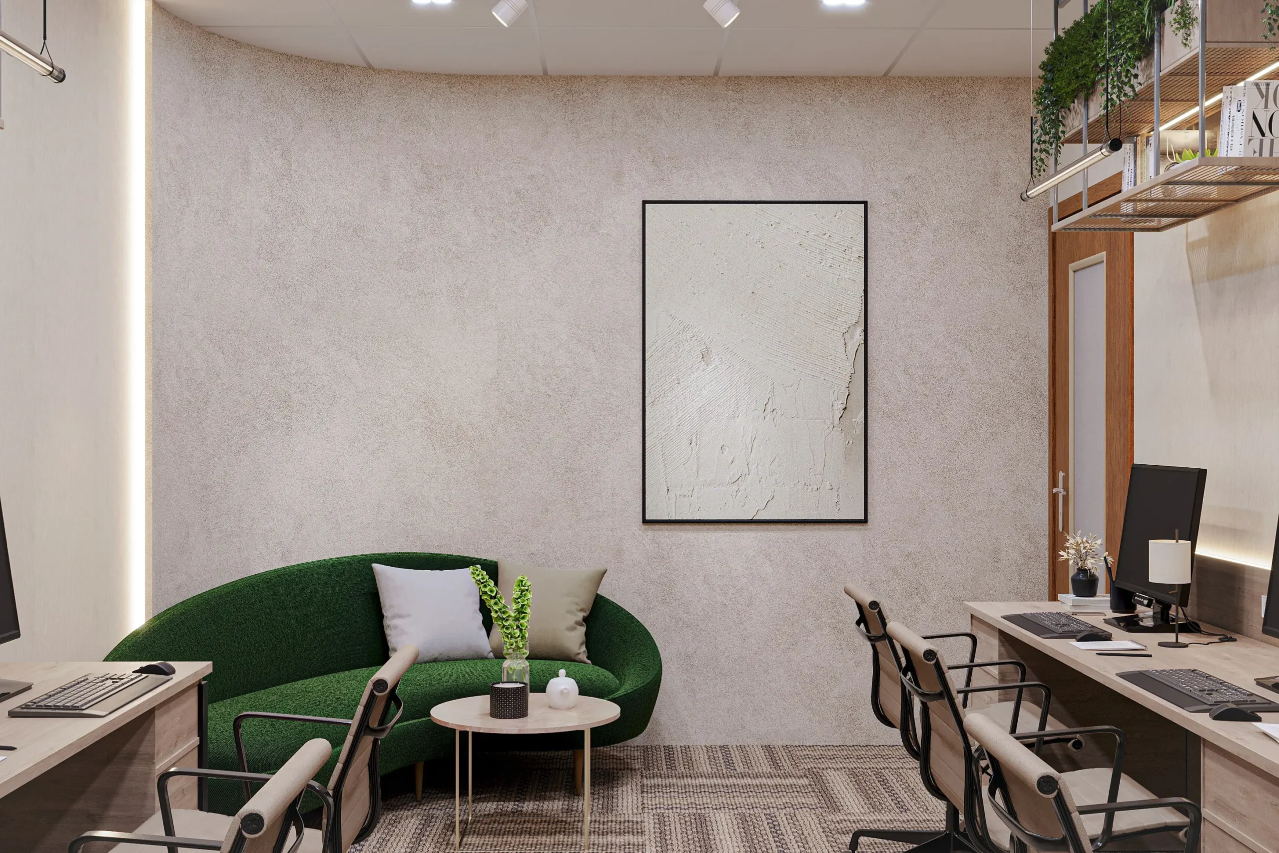 Al barsha real Estate Office Dubai :A Dubai real estate office where biophilic warmth, arched steel partitions, and natural materiality foster an environment where productivity and considered design coexist effortlessly